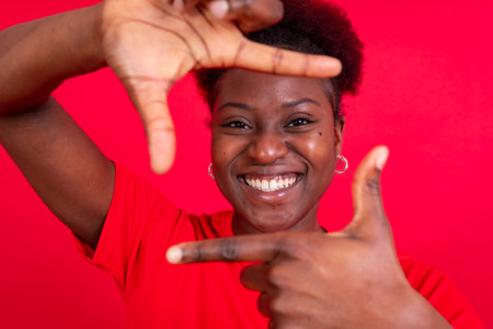 Beautiful young African woman in casual clothing making finger frame and smiling