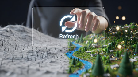 A hand touches a refresh on a screen, transitioning a dry landscape to a vibrant green one.