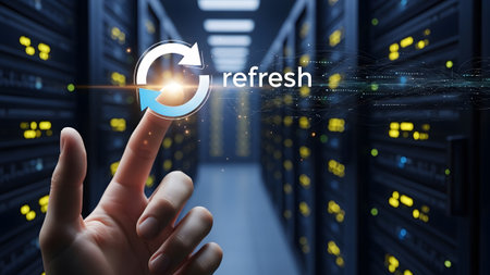 Rows showing finger touching refresh in front of server racks in a data center data...