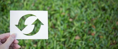 Hand holding cut paper with the recycling over green grass. Recycling sign and symbol background banner concept, Earthday