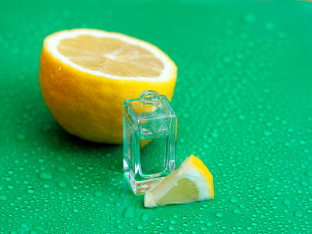 lemon perfume on green background, close-up