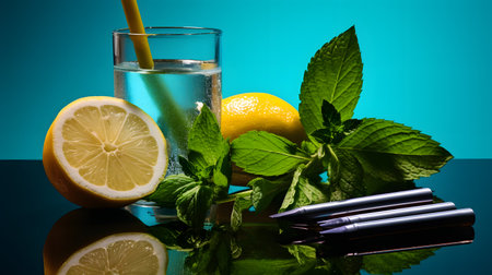 Citrus refreshment with a minty twist and icy sparkle, creating an invigorating visual treat. Dark silver and aquamarine accents enhance the scene.
