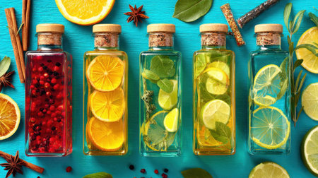 Five bottles filled with colorful infused water line a turquoise table. Each bottle features fresh fruits like lemons and herbs, creating a refreshing summer vibe perfect for hydration.