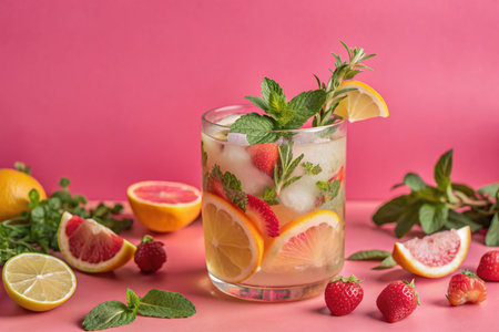 A refreshing citrus drink garnished with lemon slices, berries, and mint, styled with tropical leaves and natural lighting.