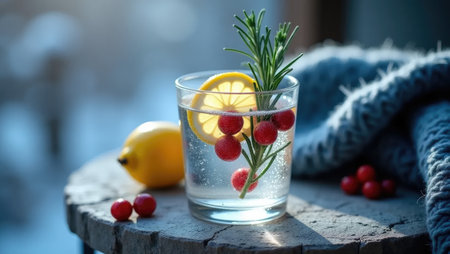 Chilly morning detox drink with lemon, cranberries, and rosemary on a stone table. Winter wellness, soft light, cozy atmosphere