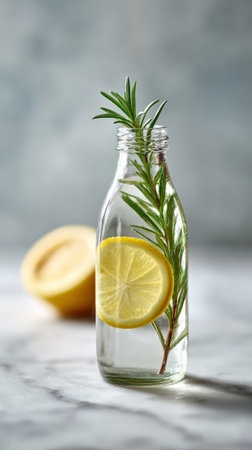 Refreshing rosemary and lemon infused water in a glass bottle sits on a marble surface. Embodying a healthy lifestyle with its detoxifying and invigorating properties. Perfect for summer refreshment