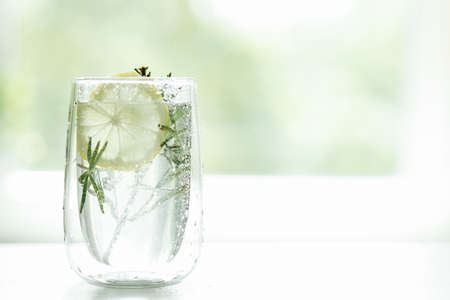 glass of clear water with lemon, rosemary