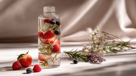 This stylish image features a glass bottle filled with vibrant berries and fresh herbs, showcasing a refreshing drink perfect for summer hydration.