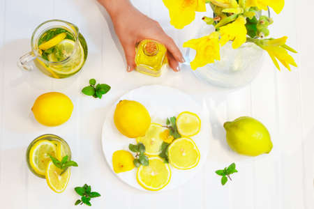 flat lay fruits lemon with women hand taken with natural light, preparing a healthy fresh drink lemon , mint and water.Helthy beverage with mentha and lemon.Hand holding bottle with lemon oil