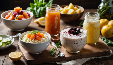 AI Generated. Delicious vegetarian dishes , Bright and appetizing with fruits