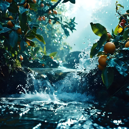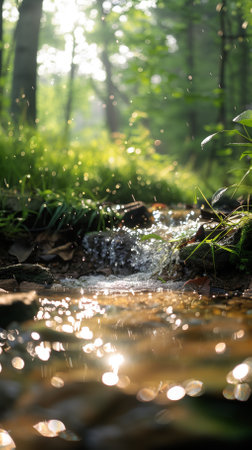 A dynamic water splash in a sunlit forest stream with vibrant green reflections. Clear details and vibrant col...
