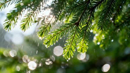An eye-level shot captures pine needles with a water droplet in focus. The blurred background features reflective water and a glimpse of sunlight. The image showcases textures, contrasts, and natural elements. It can be used for various commercial or editorial applications such as articles, websites, or advertising.