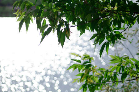 tree branches on the water background, bright round sun glare on the water. summer landscape