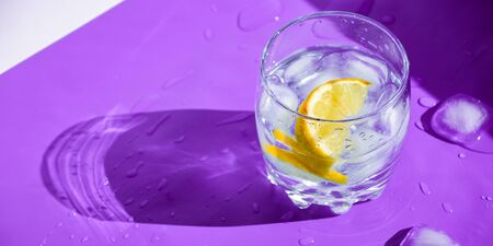 A glass of refreshing water with ice and lemon on a purple background. Heat concept, fresh. Natural light. Flat lay, top view, copy space, Soda water in glass glasses
