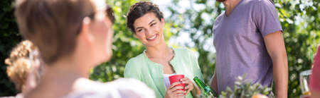 Cheerful young woman holding cup of sparkling water ice with copy space. Happy girl drinking cold cola thirsty in her hands looking at camera.