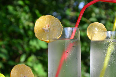 Close up a glass of sparkling soft drink with orange slices on the table in the garden. Refreshing drink.