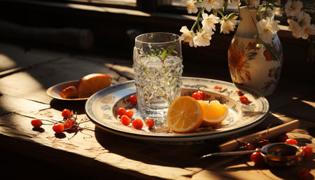 Refreshing sparkling water with lemon slice in a cozy cafe setting. concept of refreshment, hydration, simple pleasure, cafeteria ambiance, relaxing atmosphere.