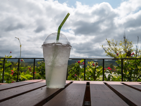 Soft drink in glass with clear ice cubes on wooden table and against nature background