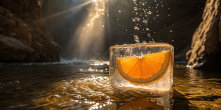 Water droplets hover around a bright orange slice in clear ice, forming a lively scene.