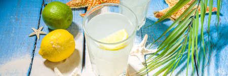 Nice refreshments at summer hot day on blue sky and sea natural background.