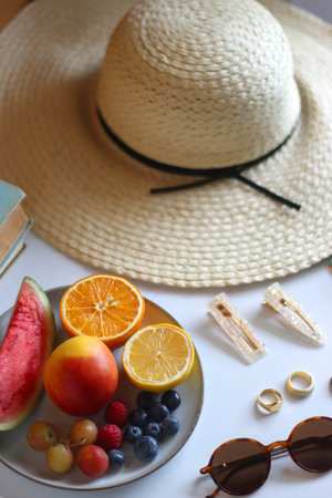 Glass of cocktail, straw hat, sunglasses, books, fresh fruit, chocolate and accessories. Summer essentials on the table. Selective focus.