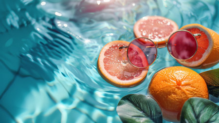 Creative summer collage. Bright fresh moments of summer. Pool, fruit, water, sea, ocean. Summer background with copy space. Mood board