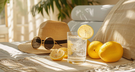 Lemonade with ice with hat and sunglasses. Summer holidays vacation concept background