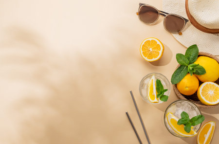 Summer layout with lemonade, fresh citrus fruits, hat and sunglasses on a beige background with shadow. Summer beach holiday concept with healthy drinks. Top view and copy space.