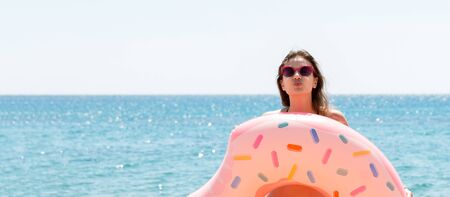 A cheerful woman with a donut-shaped swimming circle by the sea. The concept of leisure and entertainment
