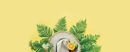 Beach straw hat, fern leaves and citrics on yellow background. Space for text. Summer travel concept. Banner.