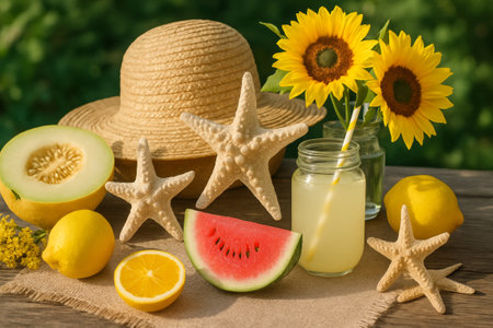 A Vibrant Summer Still Life Featuring Fresh Fruits, Sunflowers, Starfish, and Lemonade, Capturing the Essence of a Warm Day Outdoors.