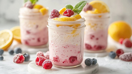 A vibrant dessert featuring layers of fresh berries, whipped cream, and lemon, elegantly served in mason jars. Perfect for summer gatherings or picnics.
