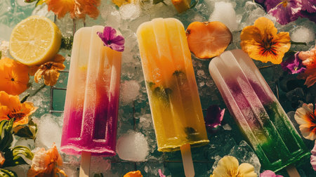 A vibrant display of colorful ice pops nestled among fresh flowers and citrus fruits, capturing the essence of summer indulgence and creativity.