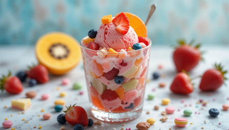 in random background there are a glass of ice cream , on the top the ice many fruits slice and rainbow candy