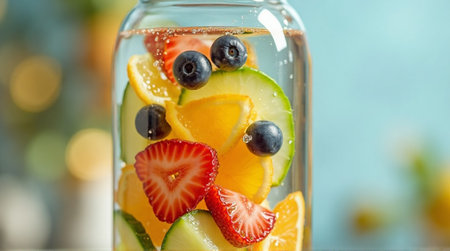 A vibrant mason jar brimming with detox fruit infused water, garnished with fresh berries and citrus slices.