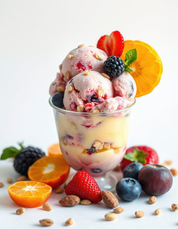 Colorful dessert with layers of ice cream, fruits, and nuts in clear glass cup on white background