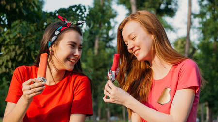 Outdoor portrait of happy three young woman holding an ice cream in summer park background. Three female friends enjoying ice cream together on a summers day