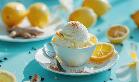 Lemon and ginger ice cream with a macchiato on a light blue background