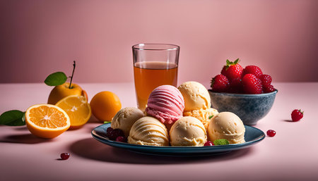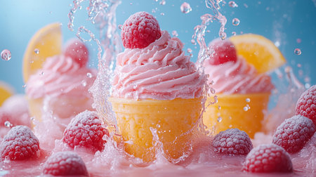 A vibrant composition of raspberry ice cream scoops splashed with orange slices and surrounded by water droplets, creating a refreshing and artistic summer vibe.