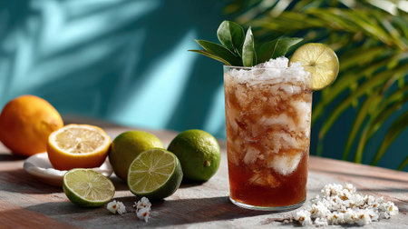 A vibrant tropical beverage garnished with fresh lime and lemon slices sits on a wooden table, accompanied by popcorn and citrus fruits. Ideal for summer gatherings.