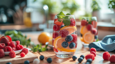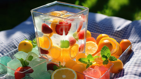 Refreshing summer beverage with fresh fruits and ice in a sunlit kitchen. That the image is generated using AI.