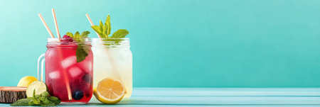Summer drink coctail in glass jar, berries and mint on wooden table