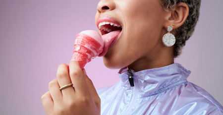 Woman, ice cream and mouth while eating pink dessert with cone against studio background. Model, zoom and lick sorbet, snack or gelato for taste in summer with professional backdrop in Los Angeles