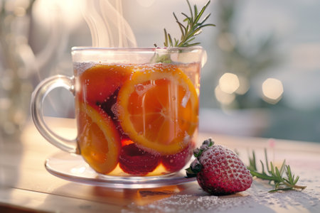 A steaming cup filled with vibrant orange slices and strawberries sits on a wooden table. Fresh rosemary adds a fragrant touch, inviting warmth during the chilly winter afternoon.
