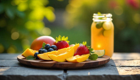 Fresh fruit platter with juice on stone table top