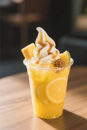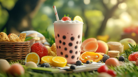 A vibrant bubble tea adorned with fruits and treats, perfect for summer. Experience the sweetness and refreshing flavors in a natural setting.