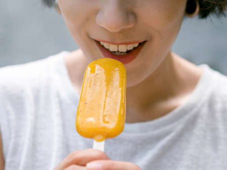 Close up yellow ice cream in beautiful happy Asian woman’s hand wearing casual white sleeveless shirt, outdoors.