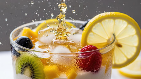 A close-up shot presents a chilled beverage, filled with ice cubes, fruit slices, and water splashes. The composition uses bright lighting, highlighting the vibrant colors of lemon, kiwi, mango, and berries. The photograph suggests a refreshing drink, suitable for use in promotional materials or editorial content.