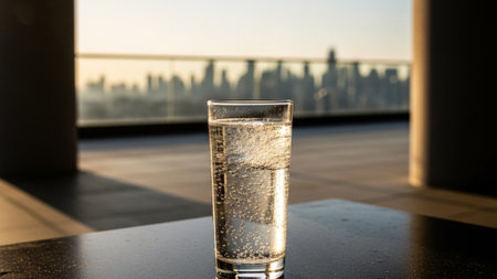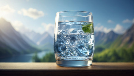 Clear glass filled with sparkling water is held in hand, set against a beautiful mountain lake landscape, emphasizing the connection between nature and refreshment