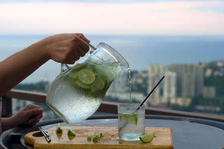 refreshing summer soft drink on the background of nature and mountains. Generative AI
